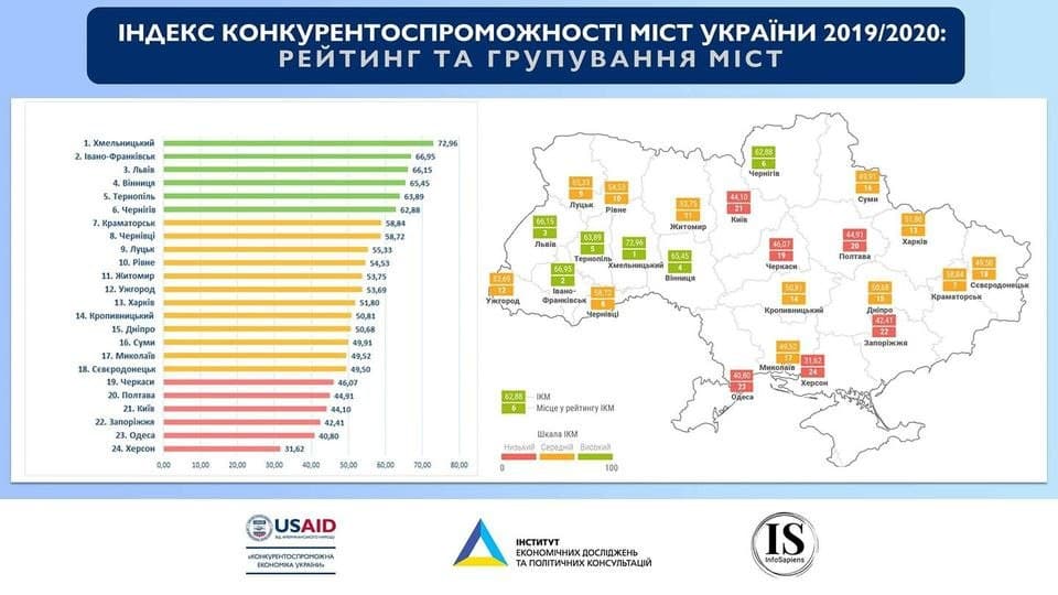 Такими є результати дослідження “Індекс конкурентоспроможності міст України (ІКМ) 2019/2020”, яке провела Програма Агенства США з міжнародного розвитку (USAID) "Конкурентоспроможна економіка України" (КЕУ) спільно з компанією Інфо Сапієнс та Інститутом економічних досліджень та політичних консультацій.